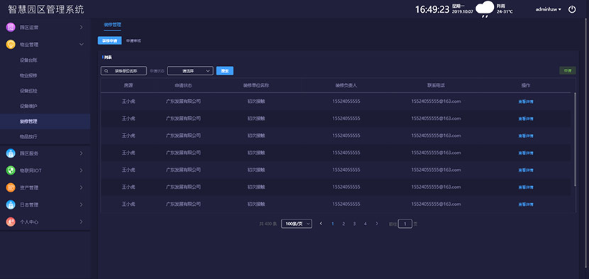 智慧园区管理平台上提供企业的装修申请服务,装修许可证办理业务,押金缴纳功能,查询正在装修企业信息(具体位置、施工期限、安全生产工作情况、装修公司、跟进负责人,物管跟进负责人等),四方协议签订情况等功能。