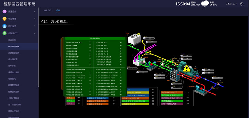 智慧园区管理平台监测内容主要包括:冷热源系统、空调通风系统、电梯系统、给排水系统、风机盘系统,对这些系统进行实时监测,故障报警,并提供报警与故障类型。系统通过OPC接口对建筑智能设备管理系统进行数据采集。