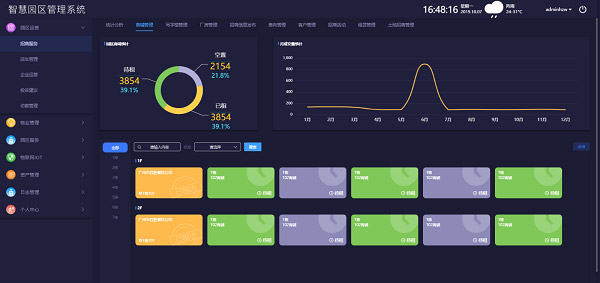 智慧园区管理平台通过对基础数据、平均租金、出租面积、出租比率等等数据进行可视化展示,给用户提供决策支持。