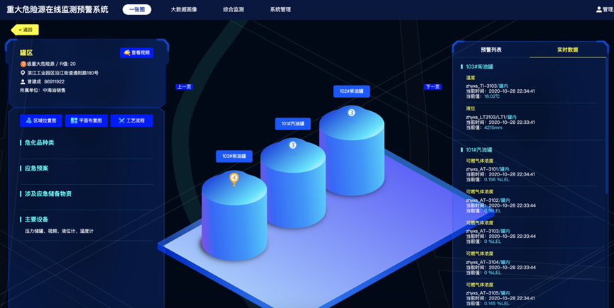 实时采集企业有毒可燃气体监测数据、压力、液位、温度、视频等监测数据,并根据企业重大危险源级别,同时考虑关键参数的报警实时状况,形成两重点一重大安全生产预警分级方法,建立预警指标体系和风险预警分级模型,计算出各重大危险源企业的风险实时预警指数,主动推送给不同类别管理人员。
