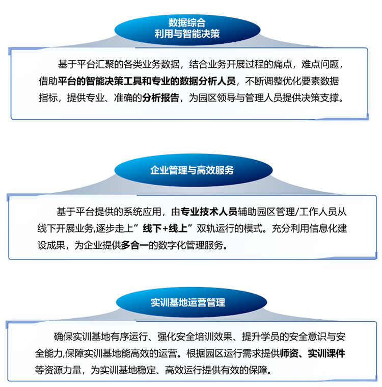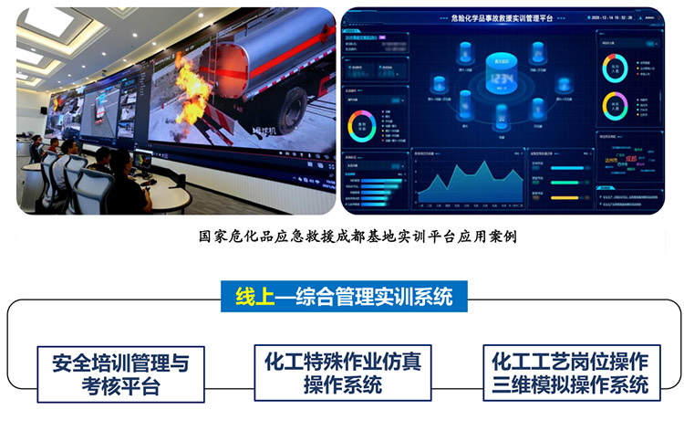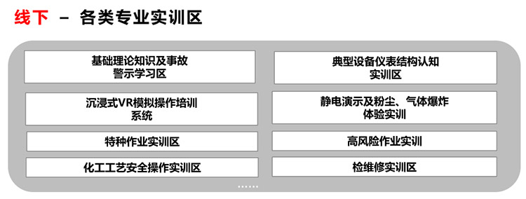 借助物联网、虚拟仿真技术、云计算、移动互联网等技术,基于《化工安全技能实训基地建设指南(试行)》结合园内企业特性,搭建线上实训管理系统,建设线下各类实训区,满足园内企业及实训基地实训资源、教学团队、实验教学等智能化管理需求,通过科学精益的管理方式提高实训基地的运行效率和质量,更好地提升职业素养和安全技能。