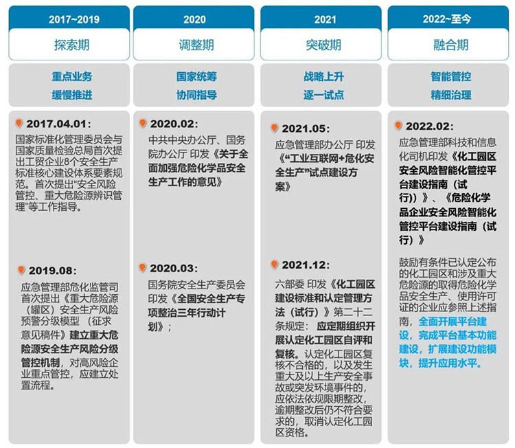 为此,中央和国家相关部委出台了一系列政策,加快推进智慧化工园区建设,并对智慧化工园区认定考核制定了严格的标准。如何通过“人防”监管方式进行多元化智能监管,怎么利用好“技防”新模式进行有效智能化监测,全新监管模式下也带来了一系列新的要求和挑战。二、政府相关部门出台的政策