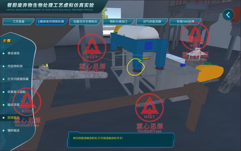 点击左上角的餐厨废弃物预处理按钮,进入实验场景,初始界面如图4.2.2.1所示: