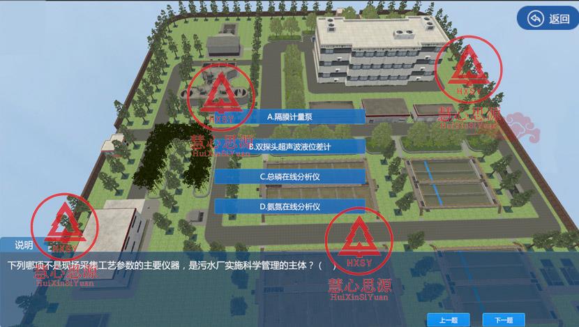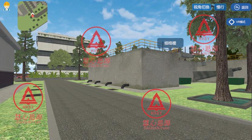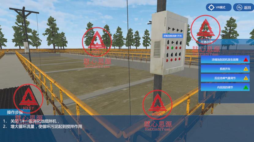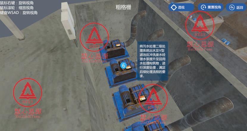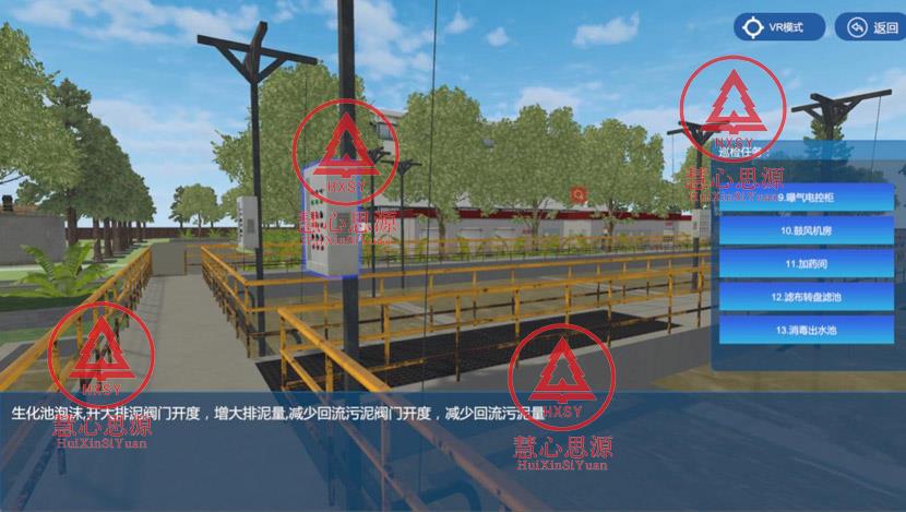 污水处理厂虚拟仿真(A2O工艺)模拟真实场景在厂区漫游,分为了两大块,分别为:生产厂区和总控室两部分;包含巡检工况:外业、内业;巡查地点包含了:粗格栅、细格栅、A2/O生化池、平流式沉淀池、纤维转盘滤池、加药间、污泥泵房。