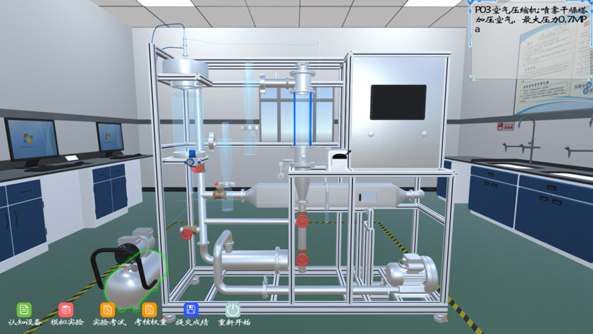 实验第一步:认识全部实验相关设备。在虚拟仿真系统内,全部场景均以1:1还原真实实验室,720°视角,让学生更快认识设备。