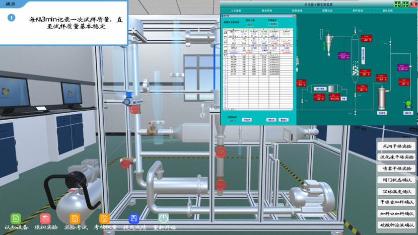 模拟实验板块内,学生可完成三种实验:风洞干燥实验、流化床干燥实验、吹雾干燥实验。根据选择实验,虚拟仿真场景内会提示对应流程,引导学生完成实验,每项实验皆有流程提示即流程介绍,帮助学生认识设备提升实验熟练度。