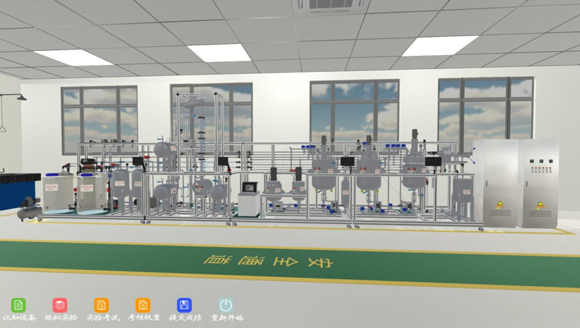 本装置包括四个工段(配料工段、乳化工段、过滤工段和精馏工段)、三个系统(热水系统、真空倒料系统、DCS控制系统),可满足10~12人同时操作使用,可以按照工段分组,每个小组协同做实验,整套设备实验用时约6~8h。