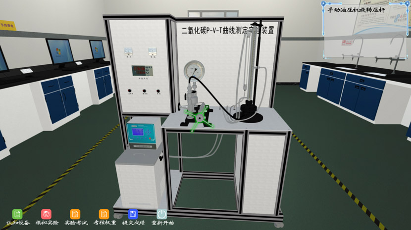 虚拟仿真系统中重要的板块除了认识这些设备原理外,还需要进行模拟实验,现实中由于设备的缺乏,使学生们接触到实验设备的情况越来少之,虚拟仿真系统便成功的解决了这一窘迫,操作者可以在仿真场景中进行二氧化碳PVT曲线测定实验,操作过程中,系统会根据对应流程,进行提示,引导操作者顺利完成实验。