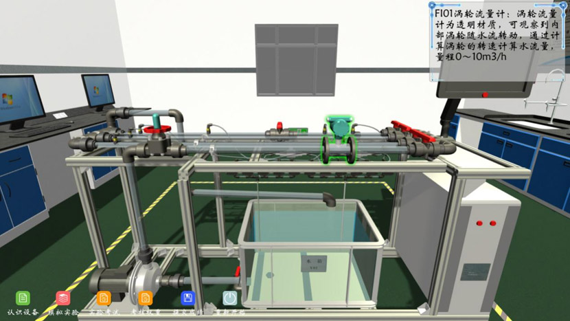 操作者初步开展实验之前,首先要做到的便是认识设备,只有认识设备,才能进行下一步操作,在流体流动阻力测定实验装置虚拟仿真实训场景中,这些设备均与现实实验室中的设备场景还原于一致,实验事场景也与现实实验室一致,熟悉得设备场景能够给操作者带来更多得课堂新体验,帮助操作者们更快的认识虚拟仿真实训中的设备。